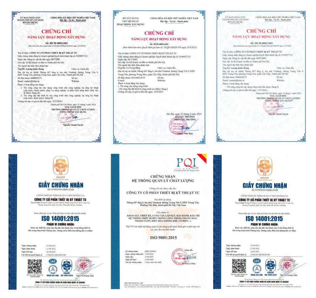 TC Global sở hữu đầy đủ chứng chỉ pháp lý và năng lực hành nghề xây dựng, đáp ứng toàn diện các tiêu chuẩn kỹ thuật trong thi công hệ thống MEP cho nhiều loại hình công trình quy mô lớn. Chúng tôi tuân thủ nghiêm ngặt yêu cầu pháp luật, đảm bảo minh bạch, an toàn và chất lượng trong mọi dự án.